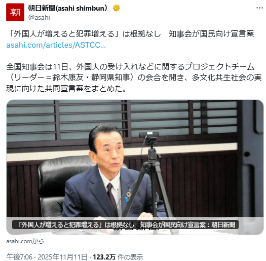 外国人犯罪について事実と異なる報告を行った知事会は、その責任を取るべきだと思う。見解の相違等で看過できる問題ではない。