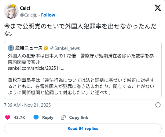 参政党が躍進してた時に、左翼が散々貼り出してたデータでは日本人と外国人の犯罪率には差がないんじゃなかったか?