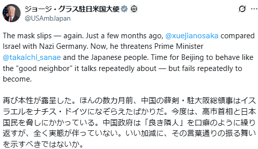 駐日米国大使ジョージ・グラス氏も、今回の中国総領事の発言を非難している。