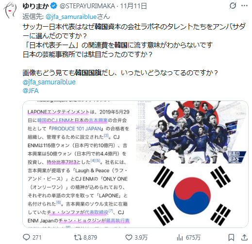 先日話題になっていた「サッカー日本代表キービジュアル問題(*韓国国旗問題)」でもそうだけれど、日本のメディア・エンタメにおいては韓国系の影響が異様に強い。韓国が好き・嫌い以前に不自然すぎる。「韓国の事」は「韓国国内」でやればいい。なぜ日本に寄生してくるのか?