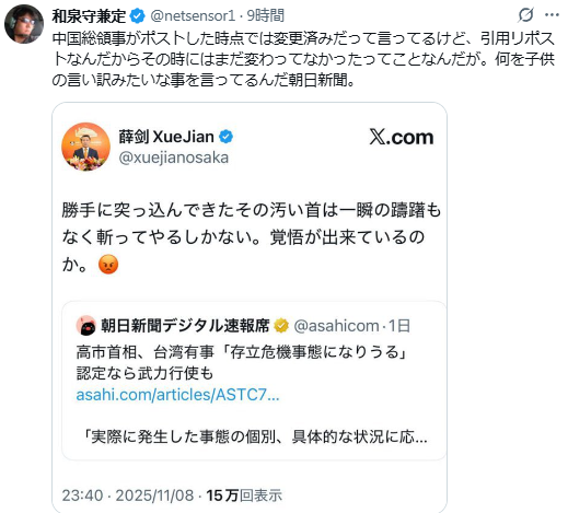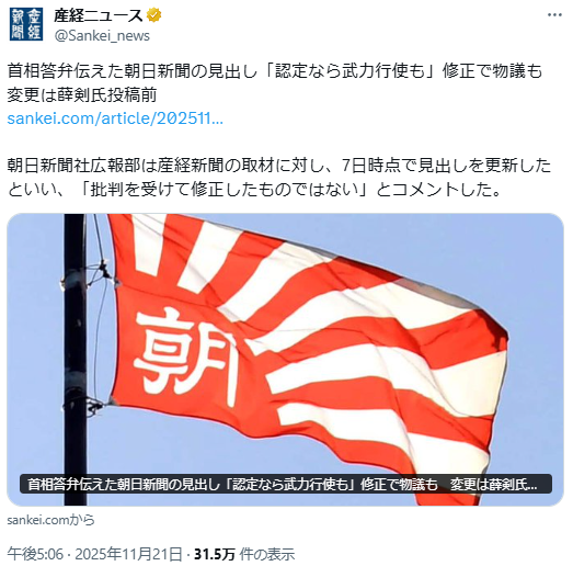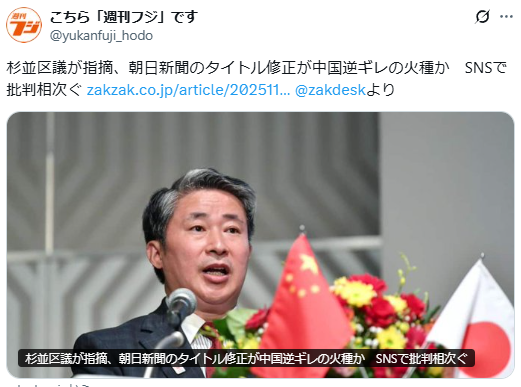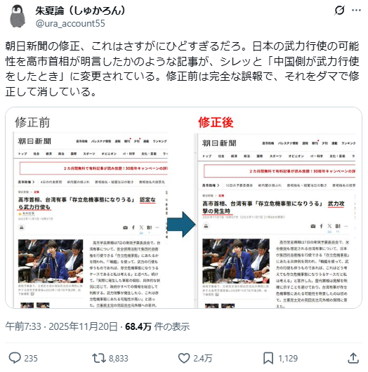 こうした批判に対して、朝日新聞側は「内容変更は(中国総領事)薛剣氏による(高市氏批判の)投稿前」等と苦しい弁明をしている。