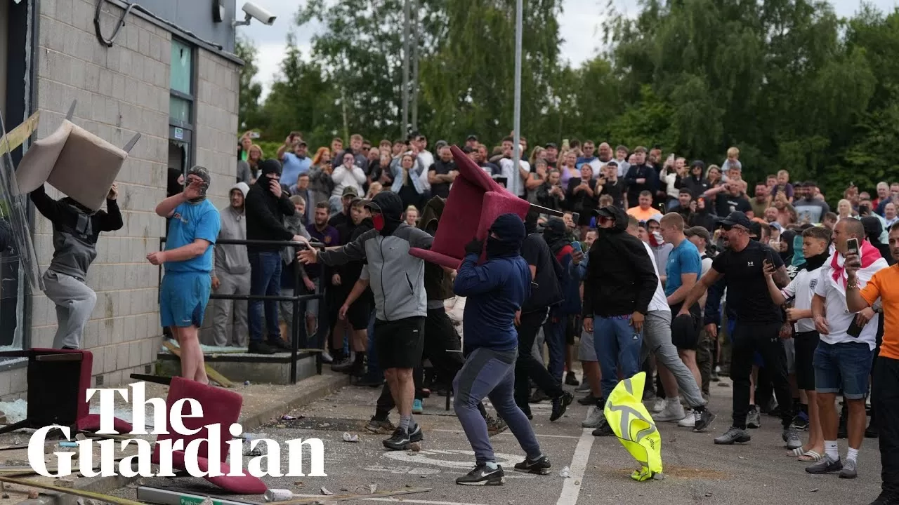 (*「難民ホテル」前で抗議活動をする英市民達↓)