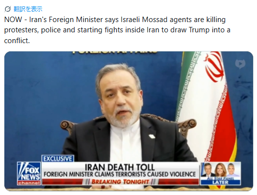 米FOXニュースの取材に答えたイラン外相は「イスラエル工作員がイラン治安当局を装い、デモ隊を殺害している」等と主張。イスラエルが意図的に「米軍介入を扇動している」と訴えた。