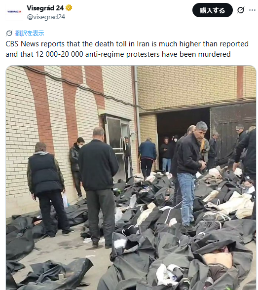 米CBSが伝えた情報によると、イランにおける抗議デモ参加者の死者数が「12000~20000人」に達したとされる イラン治安当局は意図的に停電を発生させており、通信を妨害しつつ、抗議者の虐殺を行っているとのこと。