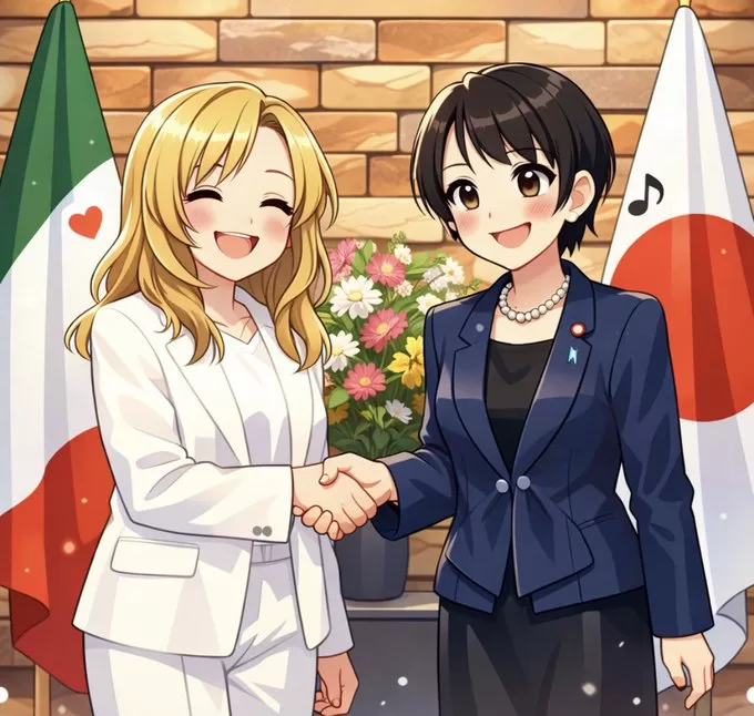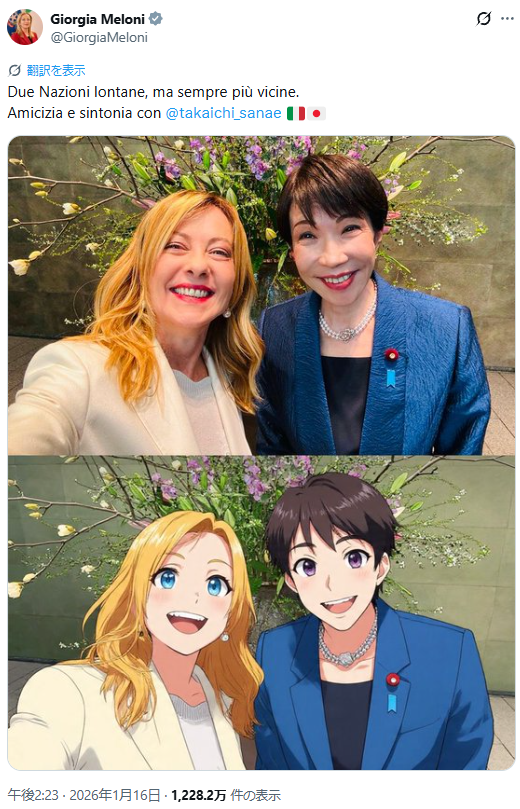 メローニ首相は16日にXを投稿。「遠く離れた二つの国だが、ますます近づいている」とつぶやき、高市早苗総理との2ショットをアップ。1枚はリアルな2ショットで、もう1枚はその2ショットをAI加工し、アニメ化した写真だった。