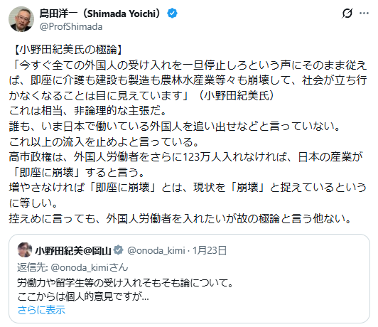 「移民労働者の受け入れ」は「経済界・経営者側による一方的な要望」であり「大部分の日本人労働者」にとっては、むしろ「低賃金競争の加速」や「労働環境改善の停滞」をもたらす要素でしかない。また、将来的には「(*景気後退による)失業率・犯罪率の激増」につながる可能性もある。