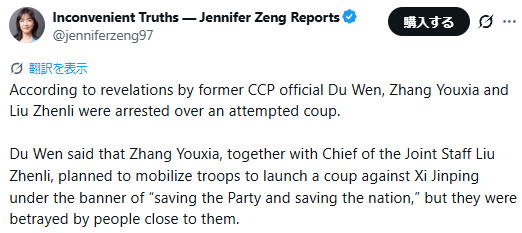 これはクーデターではなく、習近平体制による「軍部掌握」を目的とした綱紀粛正にすぎない。これまで長年続いてきた「反対者の排除」だよ。
