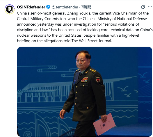 逮捕された中国軍制服組トップ「張又侠・中央軍事委員会副主席」が米国に対し「賄賂のために中国の核関連情報を漏洩した」と伝えるメディアも出てきている。