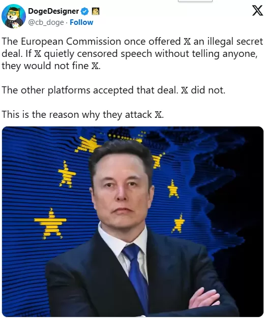また、METAやApple等とは異なり「(欧州連合からの)言論統制要請」を拒否し続けている「Xへの意趣返し」との見解もある。