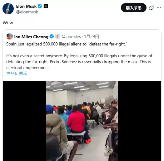 1)イーロン・マスク氏が「スペイン・サンチェス政権」による「不法移民合法化、及び、不法移民有権者化計画」を指摘する投稿をリポスト。