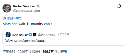 一方、サンチェス首相も「火星よりも人間が大事だ」と返信。「火星探索」に情熱を燃やすイーロンを皮肉るポストを投稿した。