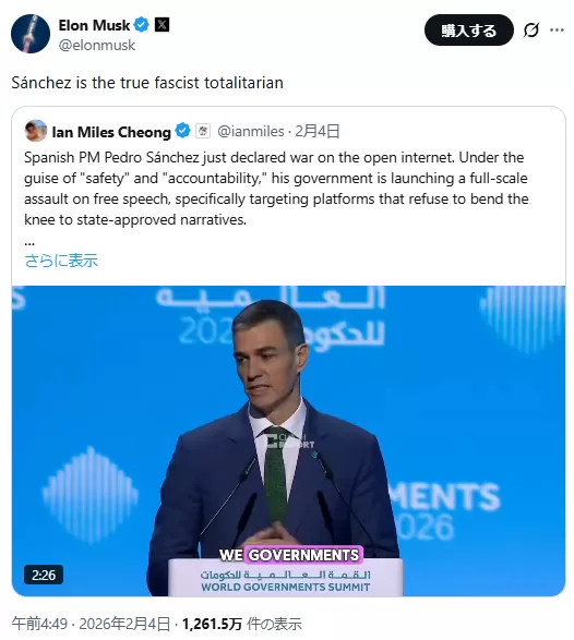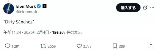 3)当てつけのように発表された「SNS規制」に対して、イーロン氏は「サンチェスは全体主義者のファシストだ」と強く批判。別の返信でも「薄汚いサンチェス」・「暴君」とコメントしている。