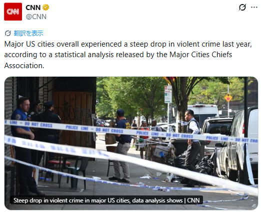 25年に全米で殺人やその他の凶悪犯罪が減少した理由を一つに特定するのはほぼ不可能だ。(CNN英語原文:While it’s nearly impossible to zero in on any one reason for why murders and other violent crime have dropped nationally in 2025,~)