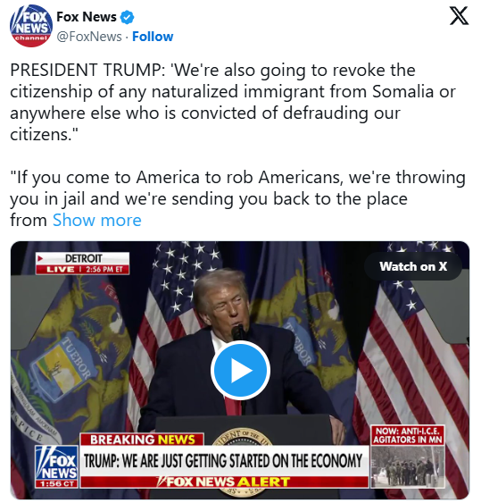 先日行われた演説において、トランプ大統領は「公金横領が発覚した在米ソマリア移民コミュニティー」を念頭に「米市民に対して不正を働いた帰化移民達は、ソマリア人だろうが誰であろうが、市民権をはく奪される」と述べた。