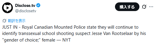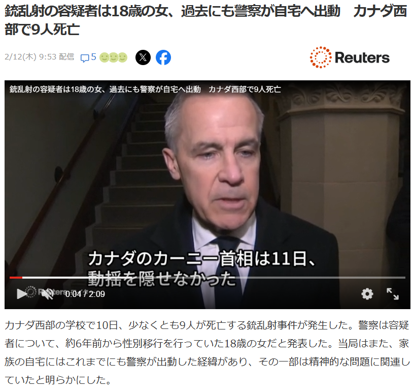 今月、カナダ西部ブリティッシュコロンビア州北東部の町タンブラーリッジの中高一貫校等で、*男性トランスジェンダー「ジェシー・バン・ルーツラー」による銃撃乱射事件が発生。自殺した容疑者を含む9人が死亡、27人が負傷した。