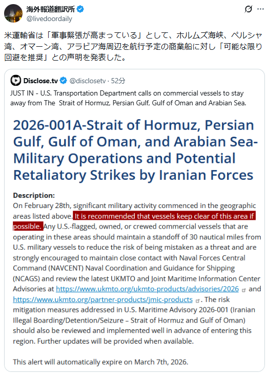 ロイターによると、イラン革命防衛隊が船舶に対し「いかなる船舶もホルムズ海峡を通過することは許されない」と伝えたとされる。