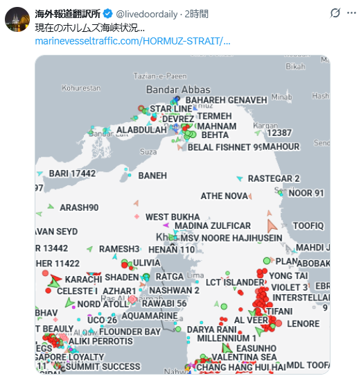 情報元:https://www.marinevesseltraffic.com/HORMUZ-STRAIT/ship-traffic-tracker