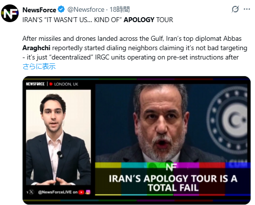 イラン内では「強硬派(*主に軍部)」と「穏健派(*主に事務方)」で連携が取れてないらしい…。中東諸国に対するイラン軍のミサイル・ドローン攻撃に関して、アラグチ外相が被害各国に「謝罪行脚」をしているとの情報もある。