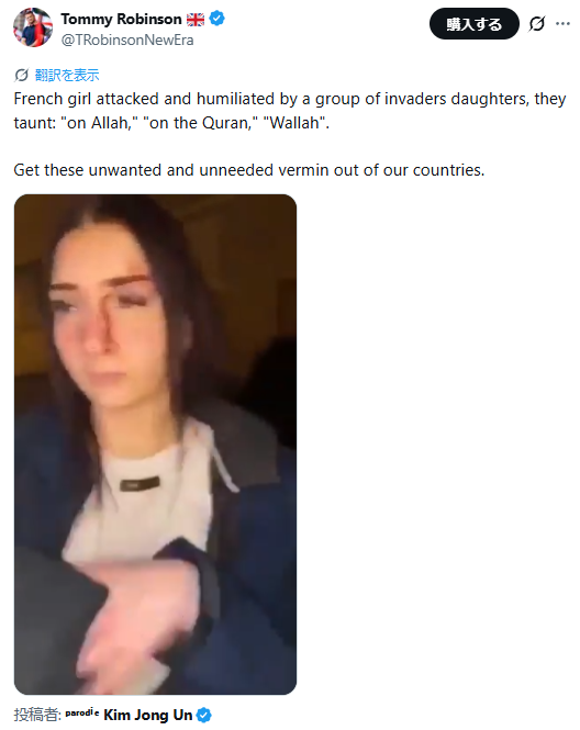 英国の反移民活動家トミー・ロビンソン氏等が投稿しているこの動画内では、白人女性を取り囲んだムスリム達が「on Allah(アラーにかけて)」「on the Quran(コーランにかけて)」「Wallah(神に誓って)」などのイスラム用語を使用しつつ、女性に攻撃を加える様子が映し出されている。