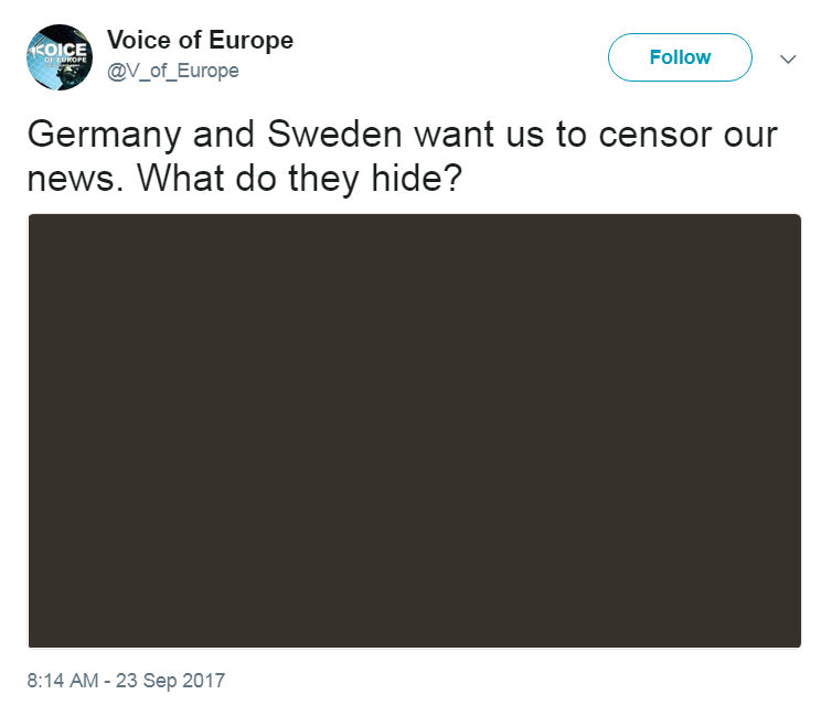 本日、保守系ツイッターアカウント”V_of_Europe(ヨーロッパの声)”の閉鎖が確認された。フェイスブック上のアカウントも同時に消された模様。詳細な経緯についてはいまだ不明である。
