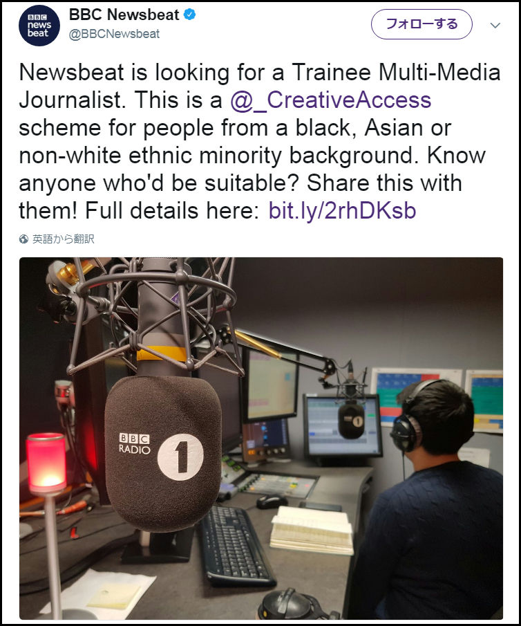 「Newsbeat」はマルチメディア・ジャーナリストの研修生を募集しています。これは「Creative Access」が提唱する計画の一環として行われるものであり、黒人、アジア人、非白人の少数民族などを対象としています。今回の求人条件に当てはまる方をご存知ありませんか?ぜひこのツイートを広めてください!詳細はこちら